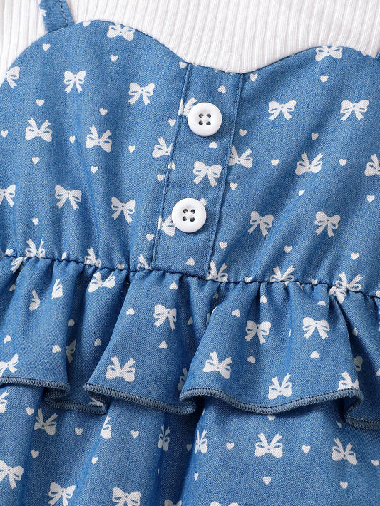Salopette in Denim con Fiocchi, Maglia a Maniche Lunghe e Fascia Coordinata