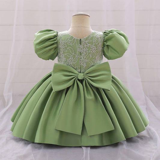 Abito Elegante Verde per Bambina con Maniche a Palloncino e Ricami