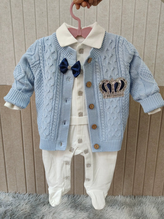 Completo neonato 3 pezzi con tutina e cardigan in maglia con corona