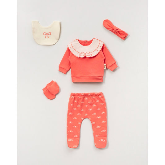 Set Neonata 5 Pezzi con Colletto Ricamato e Fiocco