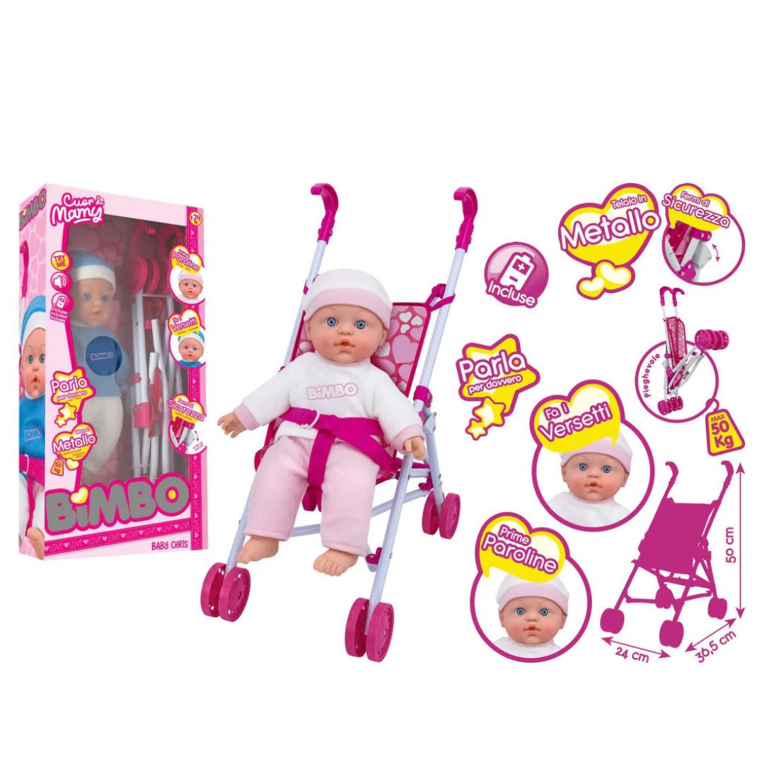 - Maxi playset composto da Baby Chris, bambola interattiva di 41 cm, e passeggino pieghevole dalla robusta struttura in metallo e dal rivestimento in romantica stoffa