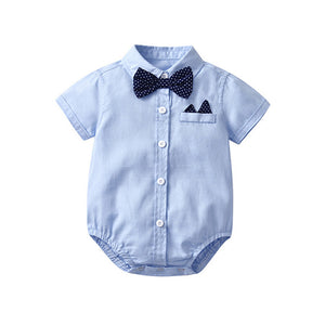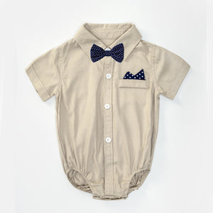 Il modello beige è arricchito da un papillon a pois blu coordinato e un taschino decorativo, ideale per battesimi, matrimoni, feste ed eventi formali.