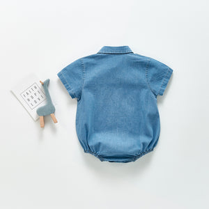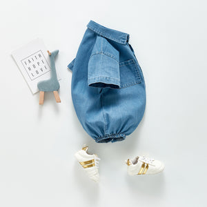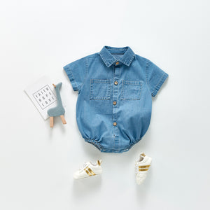 Questo adorabile body in denim per bambini unisce comfort e stile in un unico capo. Realizzato in tessuto di qualità, è dotato di maniche corte, bottoni frontali e due tasche decorative sul petto. L'elastico sul fondo garantisce una perfetta vestibilità e facilita il cambio. Ideale per ogni occasione, dalla passeggiata al parco a eventi casual, il design classico rende questo capo un must-have nel guardaroba del tuo piccolo. Disponibile in diverse taglie. Perfetto per un look fresco e moderno!