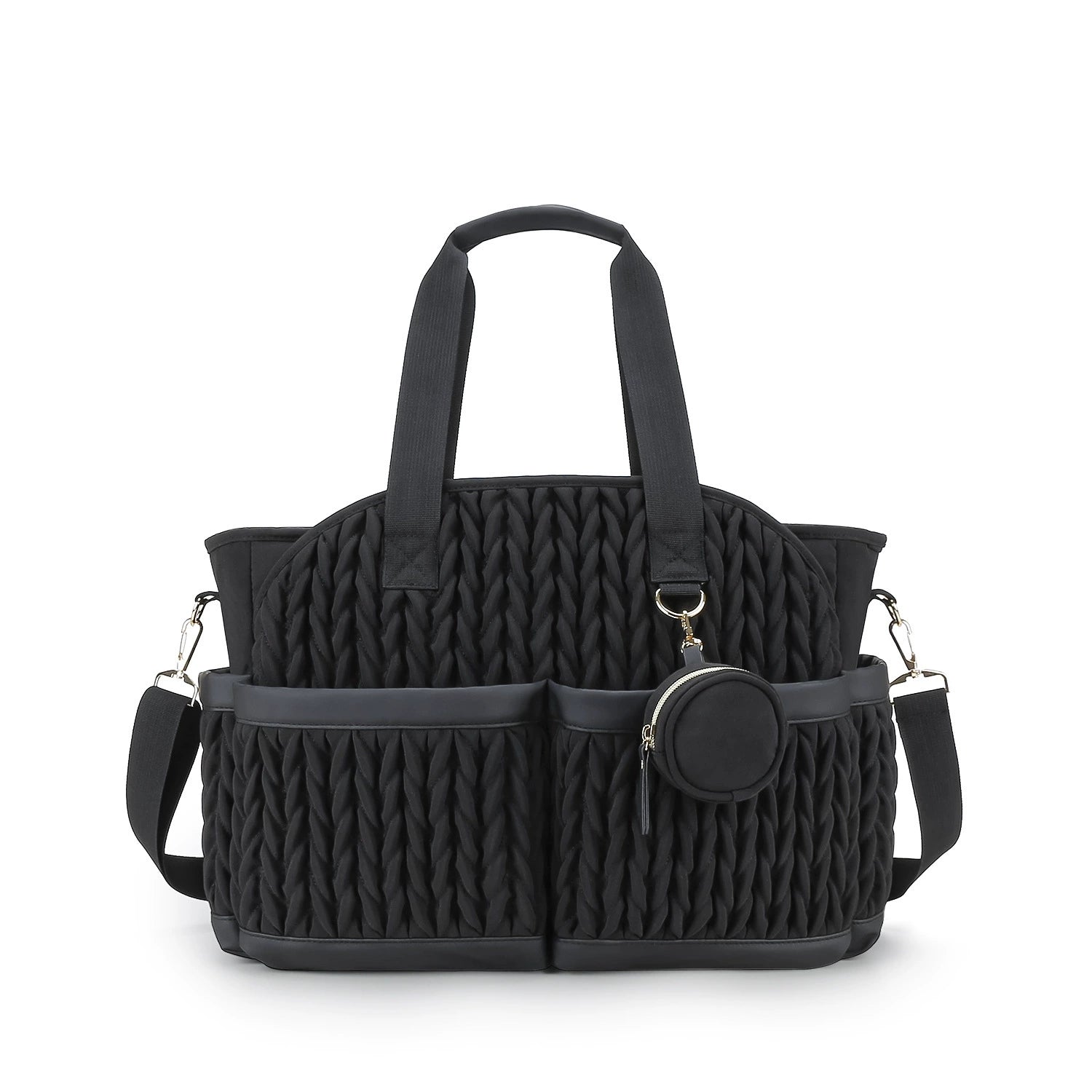 Elegante e capiente borsa fasciatoio ideale per accompagnare ogni uscita con il tuo bambino. Realizzata in tessuto resistente con finitura trapuntata, unisce praticità e stile. Dotata di ampi scomparti interni e tasche esterne porta-biberon, consente di organizzare in modo ordinato tutto l’occorrente per il neonato. La chiusura magnetica rinforzata garantisce sicurezza, mentre la tracolla regolabile e i manici rendono la borsa comoda da portare sia a mano che a spalla.