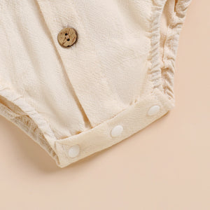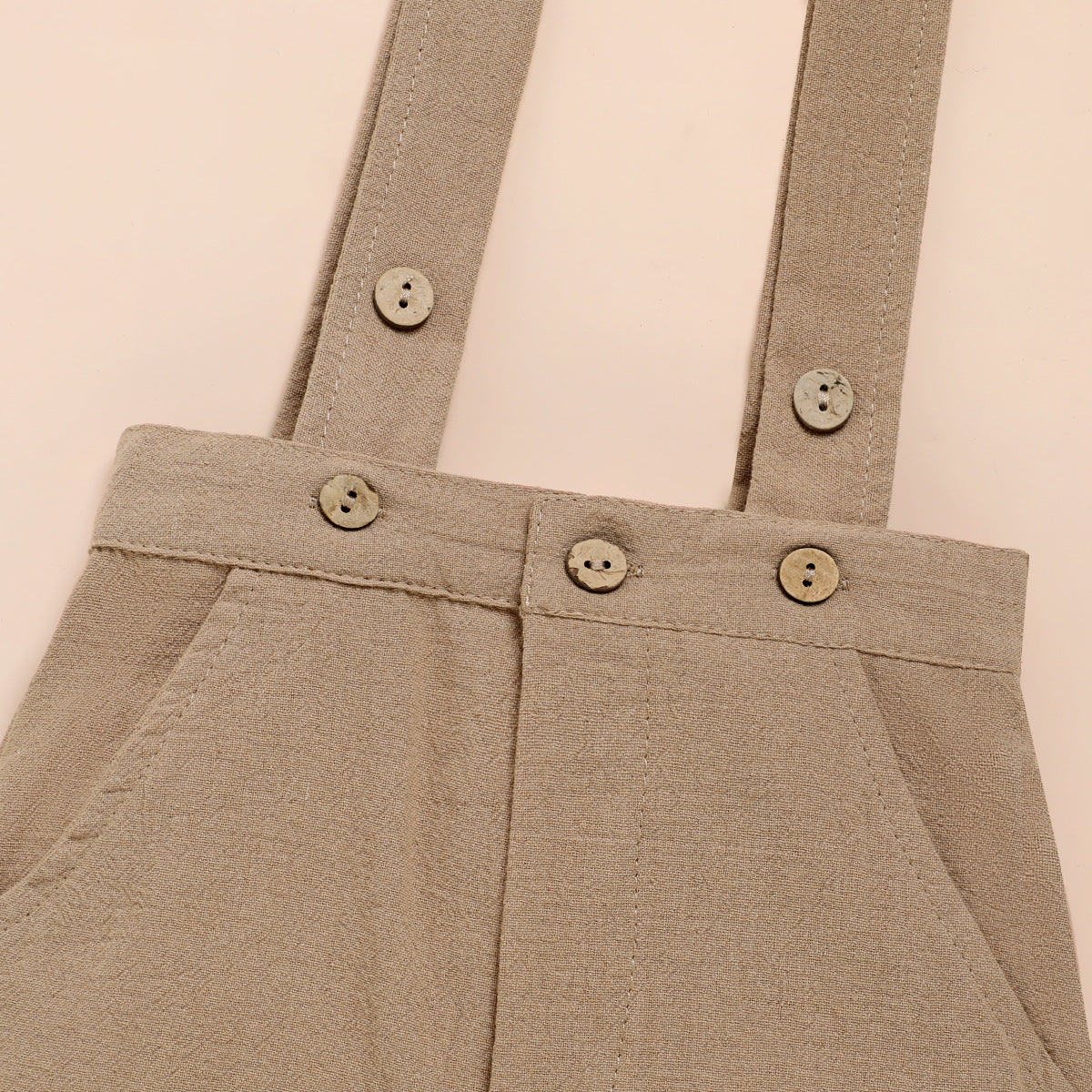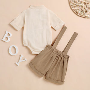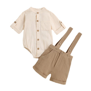Descrizione: Elegante completo per bambino, composto da un body color crema con bottoni frontali e una tasca decorativa, abbinato a una salopette a bretelle color beige. Realizzato in tessuto morbido e traspirante, è perfetto per occasioni speciali, feste o giornate casual. Il design minimalista e i dettagli raffinati rendono questo outfit pratico e alla moda, garantendo comfort e stile per il tuo piccolo.