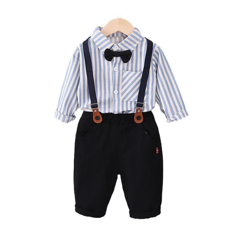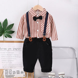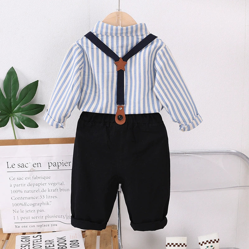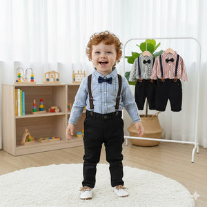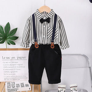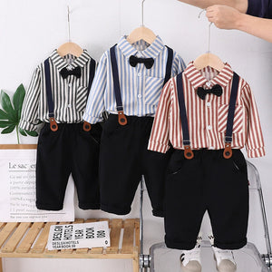 Completo elegante da bimbo composto da camicia a righe, pantaloni morbidi, bretelle regolabili e papillon, ideale per cerimonie, feste, battesimi o look da piccolo gentleman.