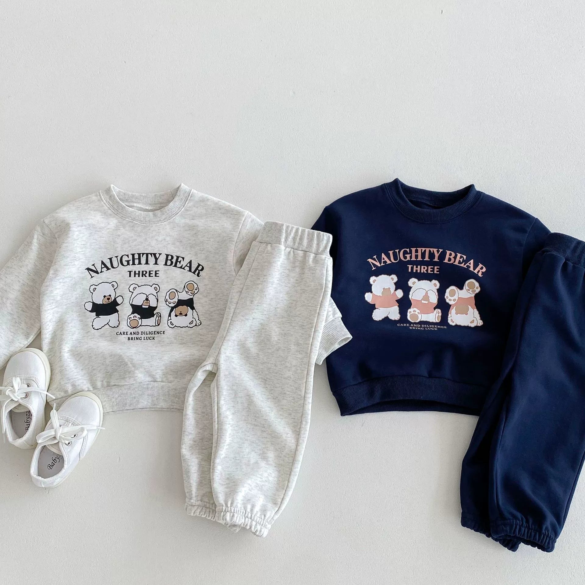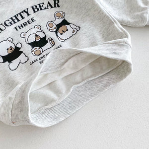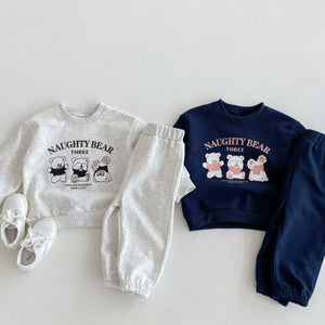 Un completo pratico e tenero per accompagnare le giornate dei più piccoli! Questo set "Naughty Bear" è composto da una felpa a maniche lunghe con simpatici orsetti stampati sul petto e da pantaloni con elastico in vita e alle caviglie per garantire massima comodità. Realizzato in morbido cotone, è perfetto per l’asilo, il gioco o il relax a casa. Disponibile in due varianti colore: grigio chiaro e blu navy.