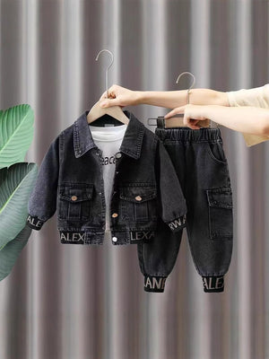 Questo completo da bambino include una giacca in denim nero effetto vintage con bottoni e tasche applicate, abbinata a pantaloni cargo coordinati con fondo elasticizzato e dettagli lettering.