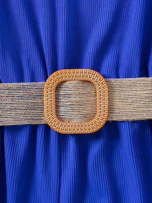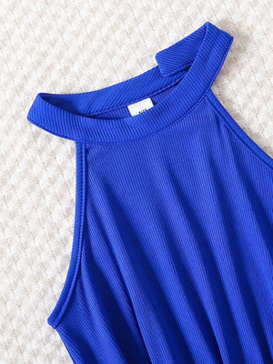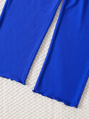 Raffinato completo per bambina composto da una jumpsuit blu royal senza maniche con pantaloni ampi e dettagli ondulati sull'orlo, abbinata a una camicia bianca annodata in vita per un tocco chic. La cintura con fibbia intrecciata valorizza la silhouette, rendendo questo outfit perfetto per occasioni speciali, eventi o cerimonie. Comodo e alla moda, è l'ideale per una piccola fashionista dallo stile sofisticato!