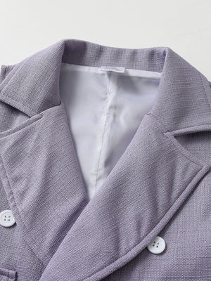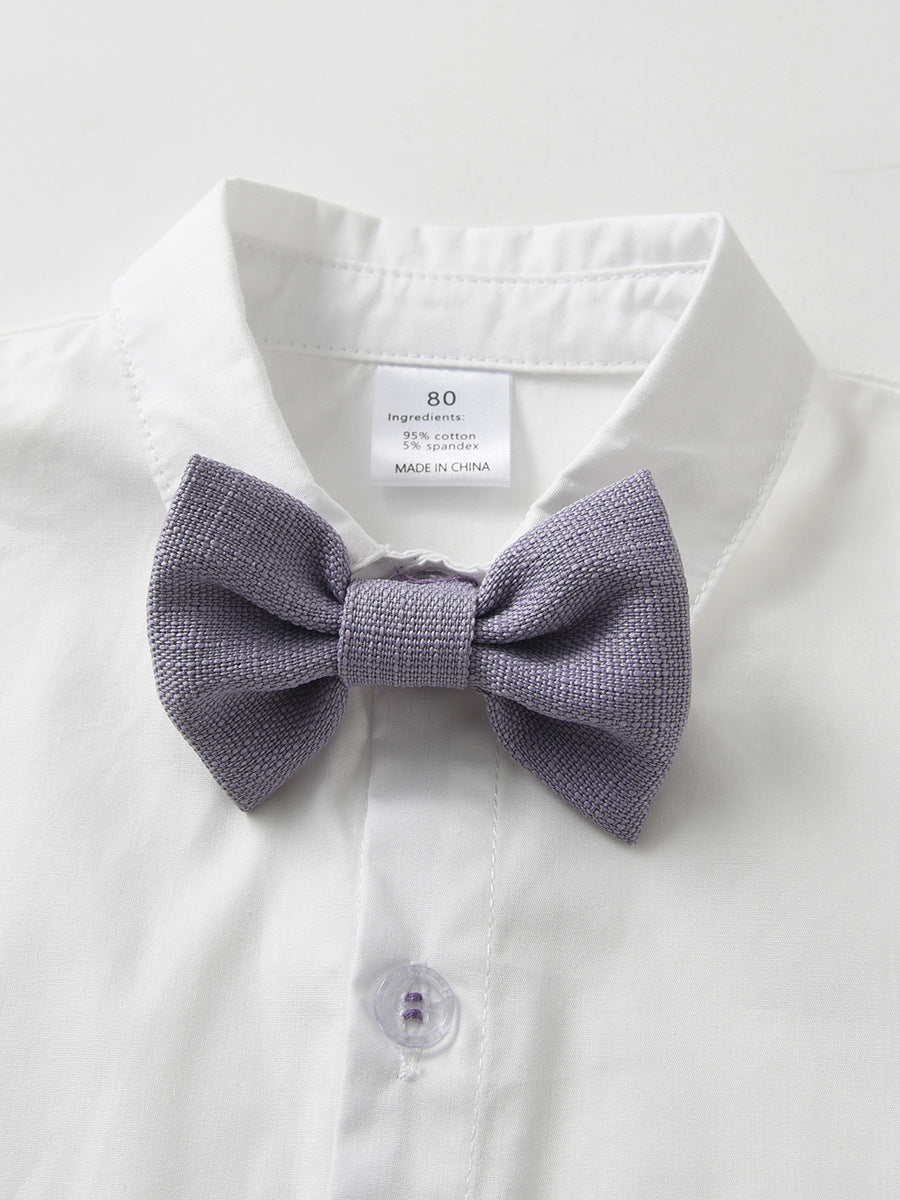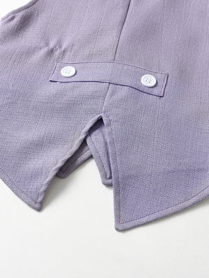 Questo set da cerimonia comprende una camicia bianca a maniche lunghe, un gilet doppiopetto lilla, pantaloni coordinati con risvolto e un papillon abbinato.