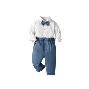 Descrizione: Raffinato completo per bambino, composto da una camicia bianca a maniche lunghe con colletto classico e papillon blu staccabile. Abbinato a pantaloni blu con elastico in vita per una vestibilità comoda e pratica. Ideale per occasioni speciali come cerimonie, feste o servizi fotografici, questo outfit unisce stile ed eleganza, garantendo allo stesso tempo il massimo comfort per il tuo piccolo.