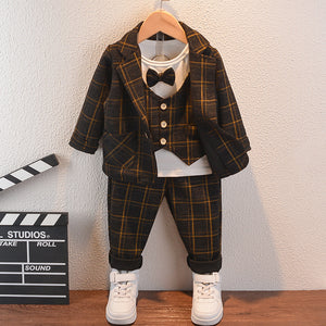 Completo elegante bambino con giacca, gilet, pantaloni e papillon – fantasia a quadri