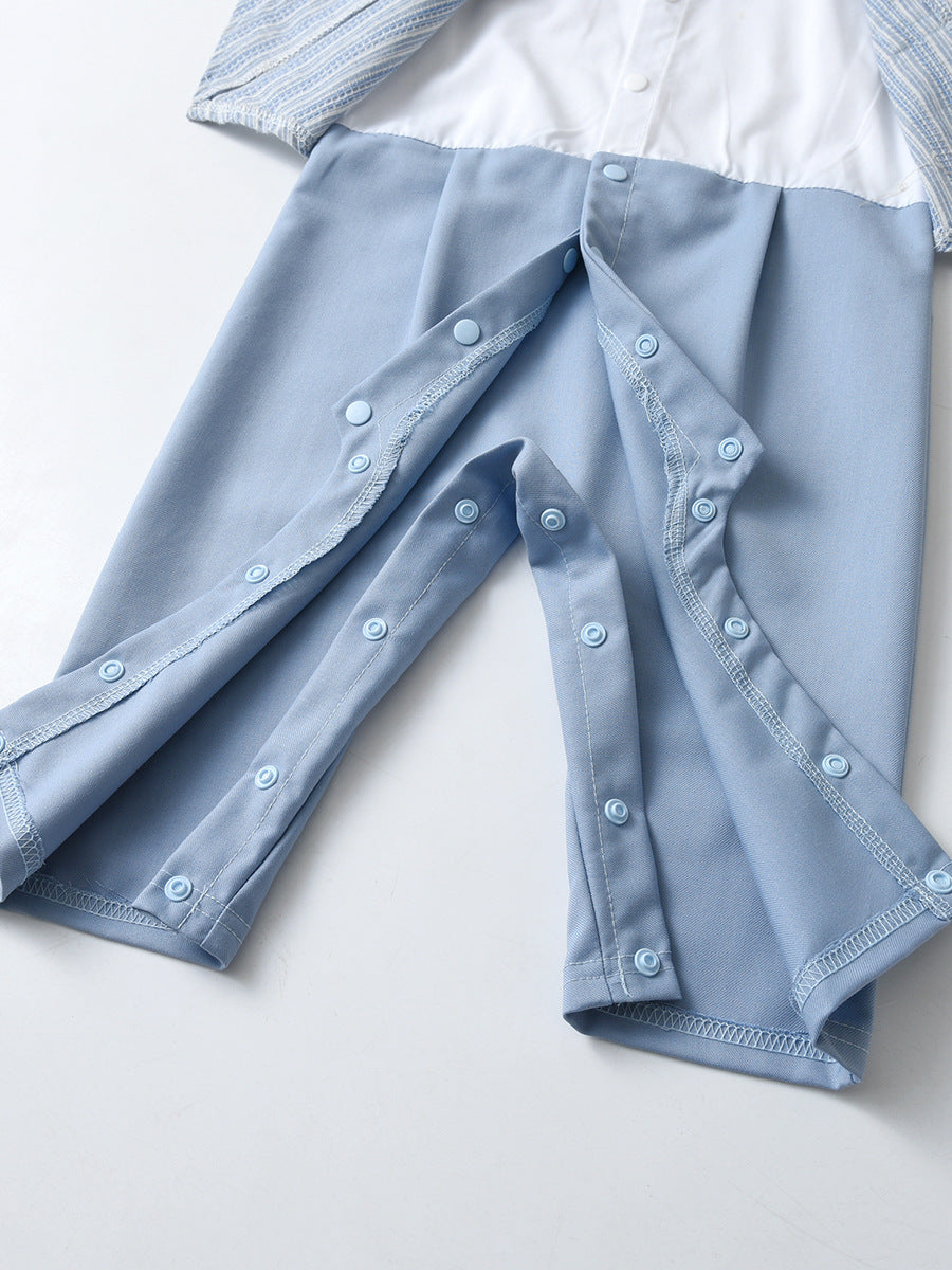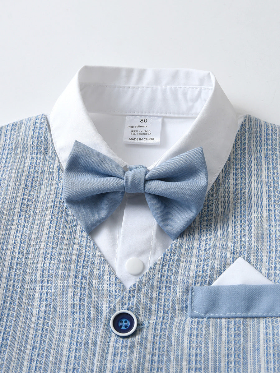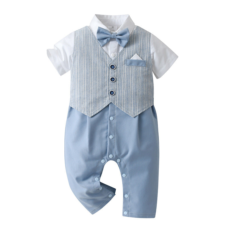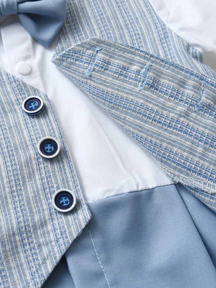 Descrizione: Questo adorabile completo elegante per neonati è perfetto per occasioni speciali come battesimi, matrimoni o feste. Composto da una camicia bianca con papillon, un gilet a righe azzurre con bottoni decorativi e una pratica tutina con chiusure a pressione per facilitare il cambio del pannolino. Realizzato in tessuti morbidi e traspiranti, garantisce massimo comfort per il tuo piccolo. Disponibile in diverse taglie per adattarsi a ogni età. Un outfit raffinato per momenti indimenticabili!