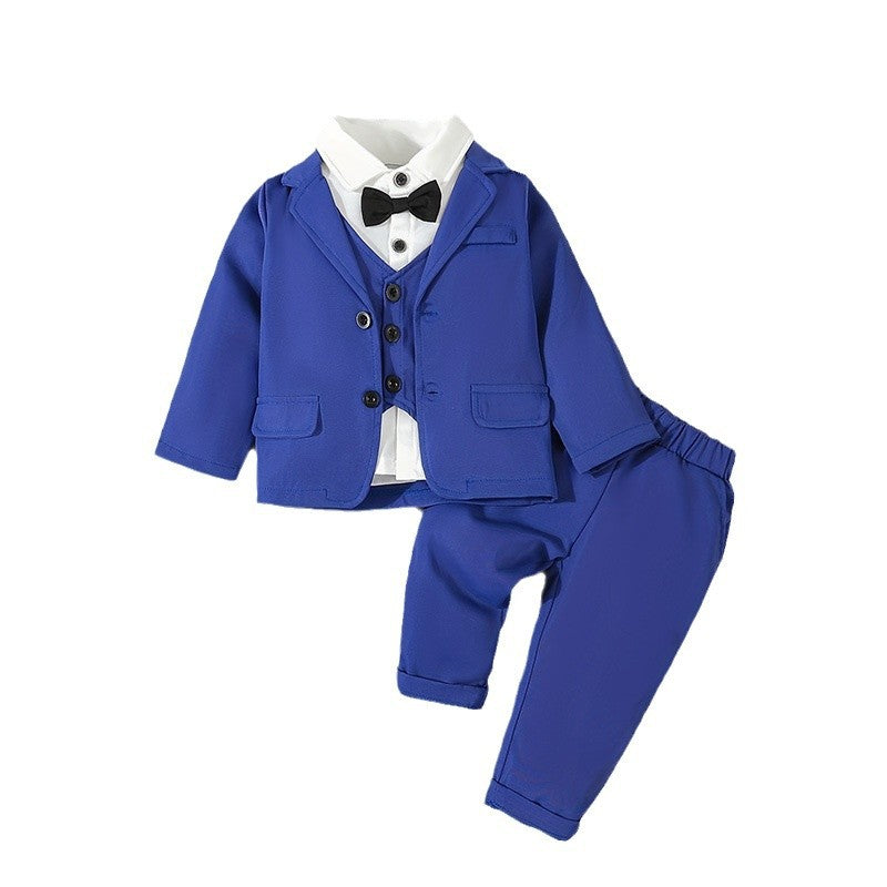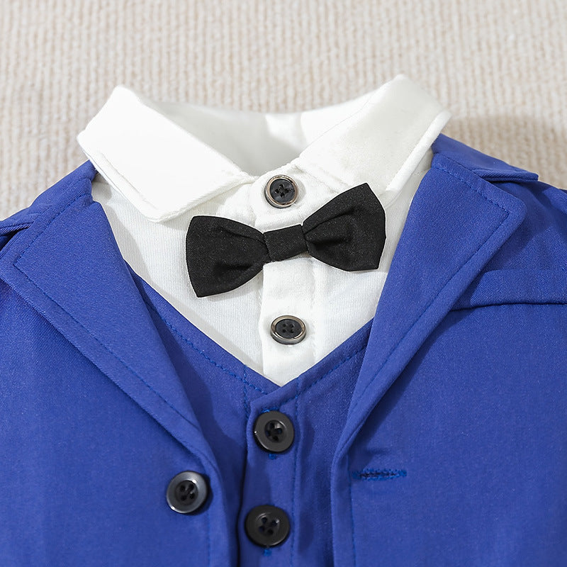 Descrizione: Un sofisticato completo da cerimonia per bambini composto da una giacca blu royal, un gilet coordinato, una camicia bianca e un papillon nero. I pantaloni abbinati presentano un design confortevole con risvolti, mentre le sneakers bianche aggiungono un tocco casual ma elegante. Perfetto per matrimoni, battesimi o altre occasioni formali, questo outfit unisce stile e praticità per i più piccoli.