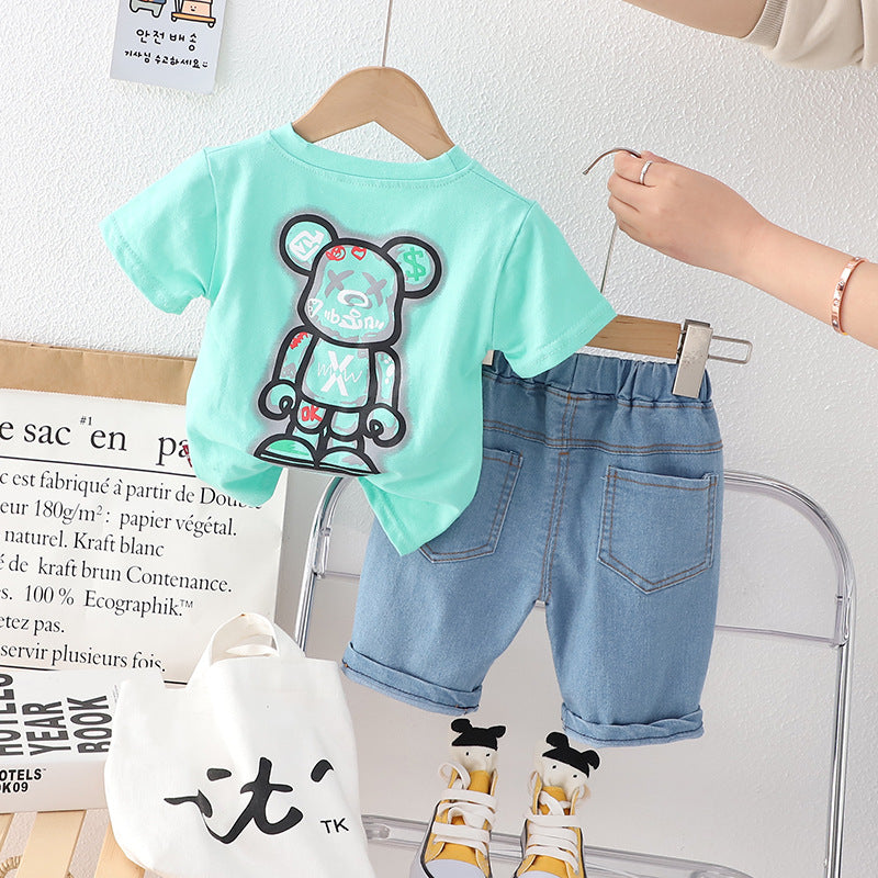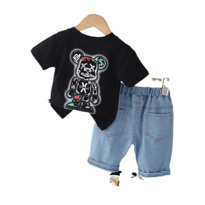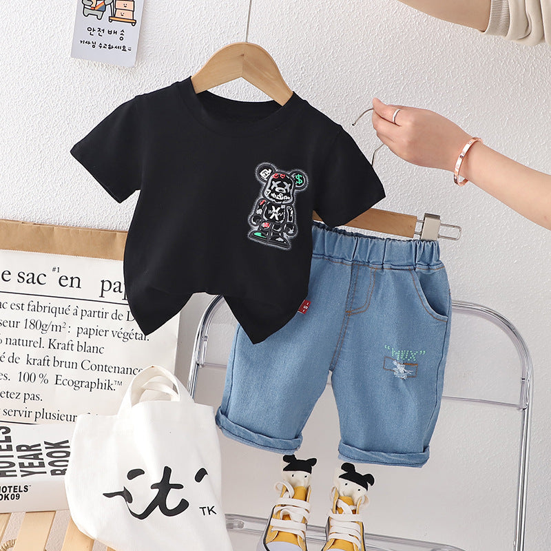 Perfetto per un look fresco e alla moda, questo completo casual per bambino include una T-shirt nera con un divertente dettaglio grafico e un paio di shorts in denim con risvolti. Realizzato in materiali confortevoli e traspiranti, è ideale per giochi all'aperto, giornate estive o passeggiate in famiglia. Stile semplice ma d'impatto per i piccoli esploratori! 🐻👕👖✨