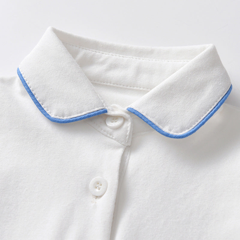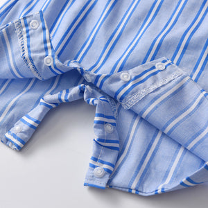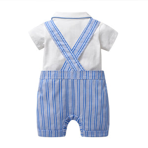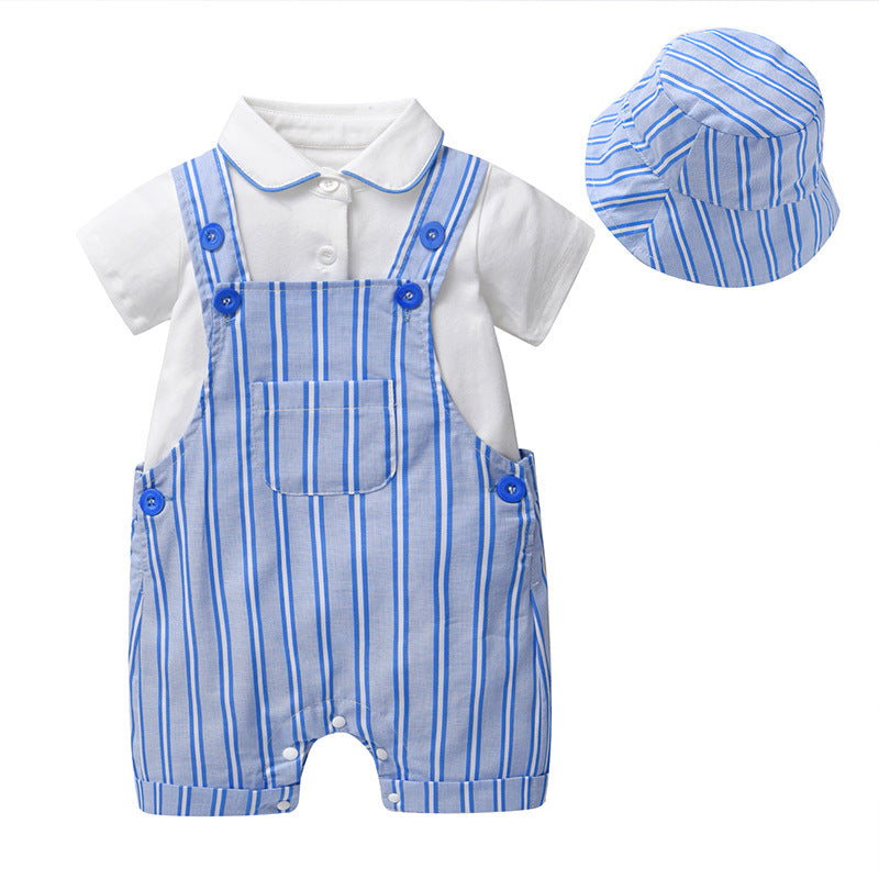 Descrizione: Delizioso completo per neonato composto da una salopette a righe blu e bianche con bottoni decorativi e una comoda taschina frontale. Il set include una t-shirt bianca con colletto classico e un cappello coordinato a righe per protezione dal sole. Perfetto per un look estivo fresco e alla moda, ideale per giornate all'aperto o occasioni speciali.