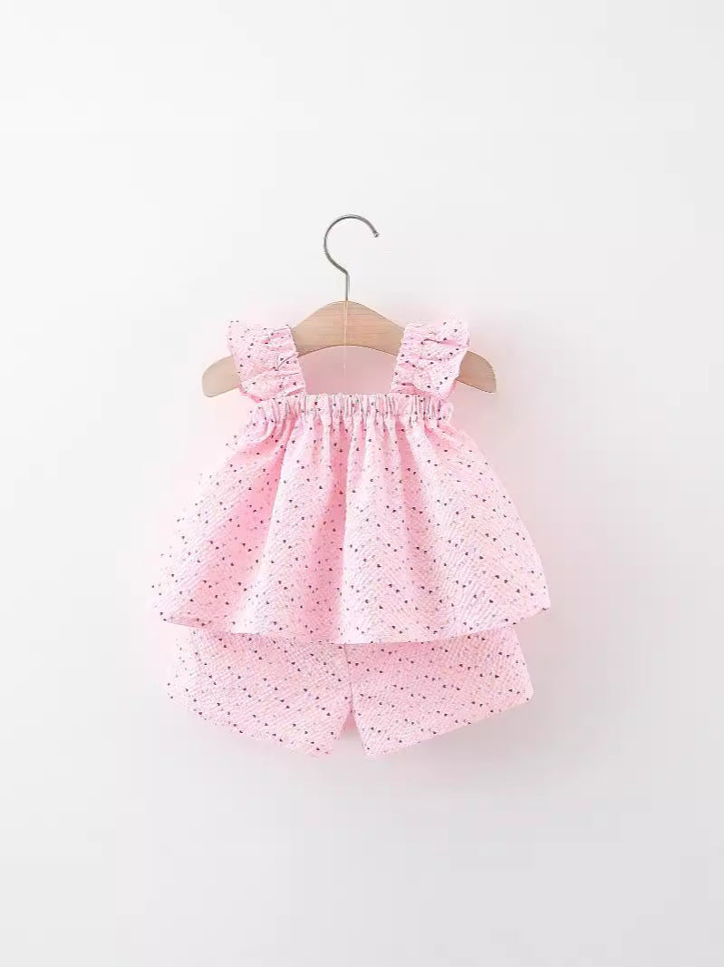 Un adorabile completo per le giornate estive della tua piccola! Questo set include un top leggero con volant e un grande fiocco decorativo, abbinato a shorts coordinati. La stampa a pois colorati aggiunge un tocco vivace e allegro. Realizzato in tessuti morbidi e traspiranti, è ideale per mantenere la tua bambina comoda e stilosa durante passeggiate, feste o momenti di gioco. Perfetto per bambine dai 6 mesi ai 3 anni. Un outfit fresco e dolcissimo per le calde giornate estive! ☀️✨