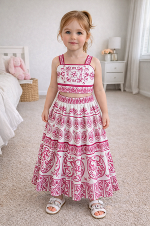 Composto da top crop con spalline larghe e da una gonna a ruota ampia, è ideale per eventi speciali, feste estive e servizi fotografici.
