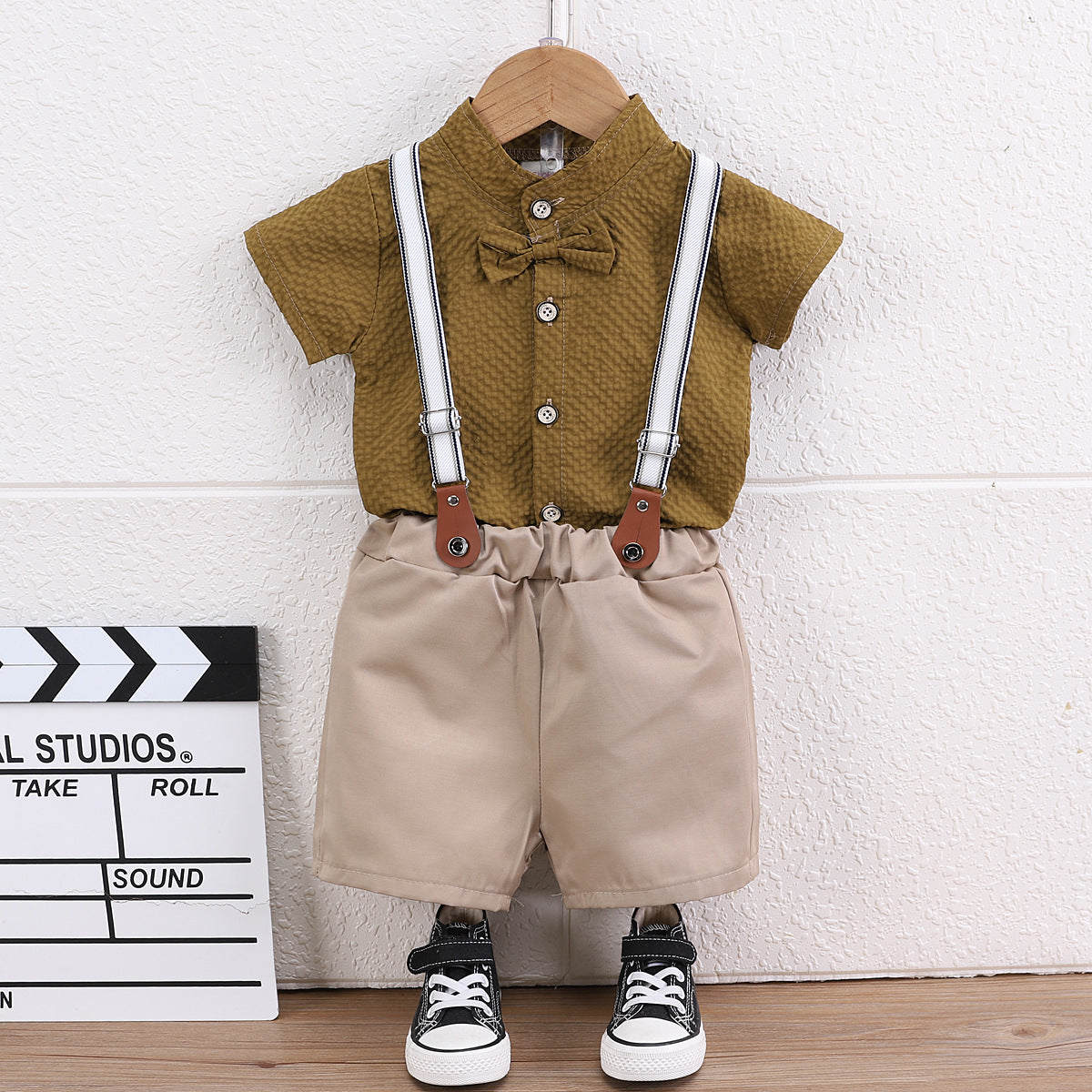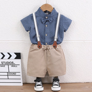 Un look elegante e fresco per i piccoli gentlemen! Questo adorabile completo estivo è composto da una camicia a maniche corte, pantaloncini beige e bretelle, il tutto completato da un papillon per un tocco di classe. Perfetto per occasioni speciali o per aggiungere uno stile unico al guardaroba quotidiano.