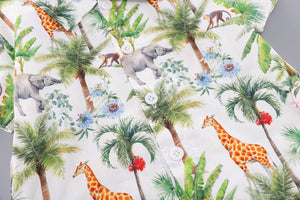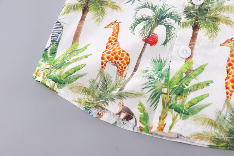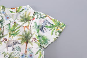 Esplora il mondo con stile con questo adorabile completo estivo per bambino! La camicia con stampa safari, ricca di dettagli con giraffe, elefanti e palme, si abbina perfettamente ai pantaloncini color cammello per un look fresco e vivace. Realizzato in tessuto leggero e traspirante, è ideale per giornate calde, vacanze o passeggiate all'aperto. Comfort e stile per ogni piccola avventura! 🐘🦒🌴✨