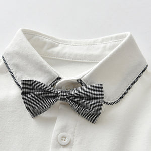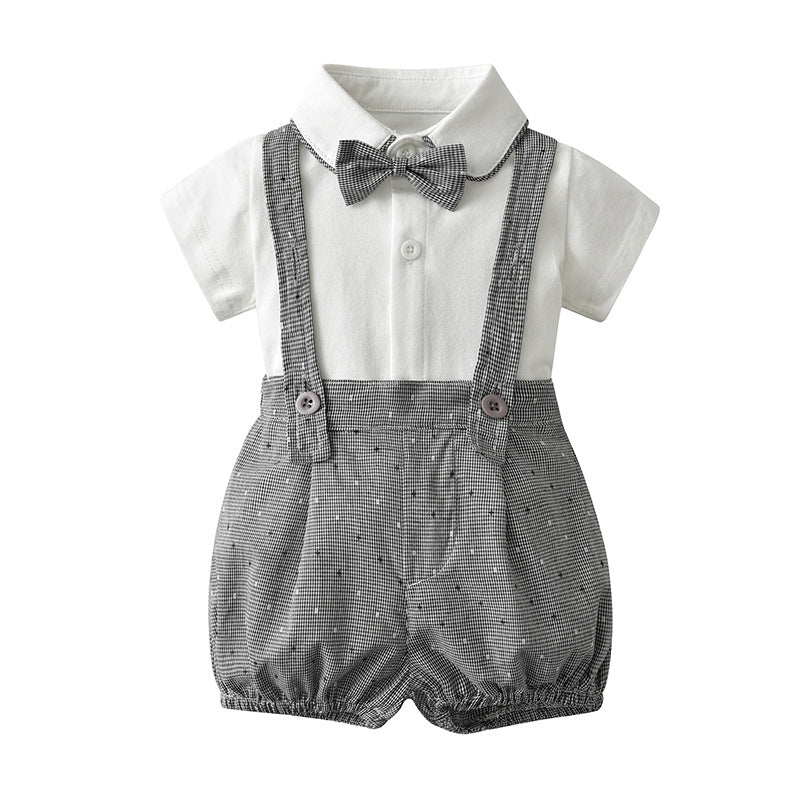 Questo adorabile completo per neonato è perfetto per occasioni speciali come matrimoni, battesimi, feste e servizi fotografici. Include una camicia bianca a maniche corte con colletto classico e un papillon abbinato per un tocco sofisticato. Le bretelle e i pantaloncini a vita alta con elastico aggiungono un dettaglio chic e pratico, garantendo il massimo comfort per il tuo piccolo. Realizzato con tessuti di alta qualità, morbidi e delicati sulla pelle, questo completo unisce stile ed eleganza in un design irresistibile.