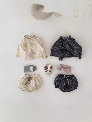 Il set è composto da blusa con maniche lunghe arricciate e colletto con volant, abbinata a culotte coordinata con elastico in vita e laccetto decorativo. La vestibilità morbida consente libertà di movimento, rendendo il completo perfetto sia per l’uso quotidiano che per occasioni speciali.