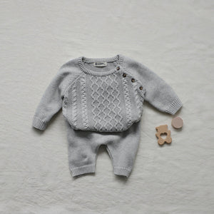 Un set caldo e confortevole composto da maglioncino lavorato a trecce e pantaloni abbinati, perfetto per i mesi più freschi.