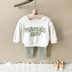 Dolce, stiloso e super comodo! Il completo “Mama's Boy” è pensato per i piccoli ometti dal cuore tenero. La felpa panna con scritta 3D “MAMA'S BOY” è abbinata a leggings verde salvia con tasche applicate: un mix perfetto di comfort e tendenza per look da coccolare ogni giorno.