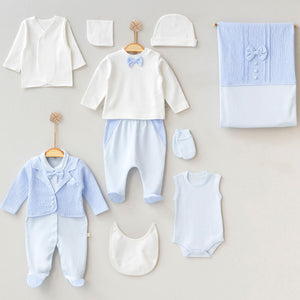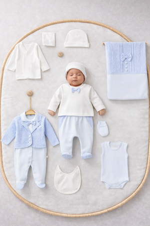 Questo raffinato set neonato da 10 pezzi è realizzato in morbido cotone di alta qualità, perfetto per la pelle delicata del tuo bambino. Con una combinazione di colori tenui azzurro e bianco e dettagli eleganti come il papillon, questo set è ideale sia per occasioni speciali che per l'uso quotidiano, offrendo comfort e stile in ogni momento.