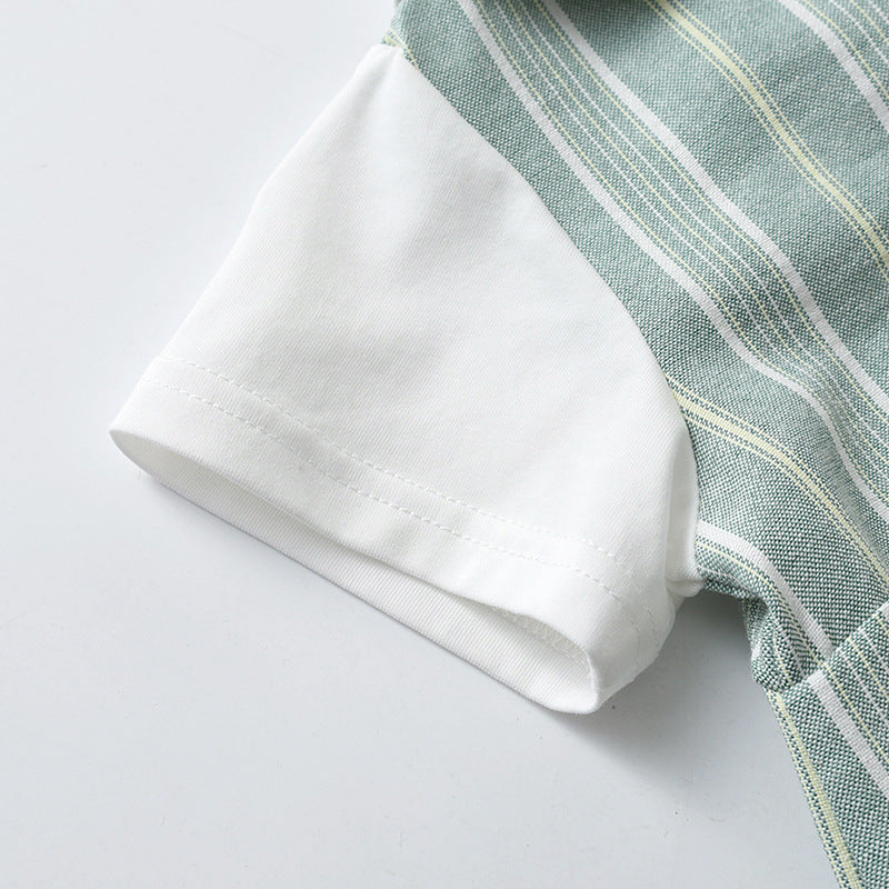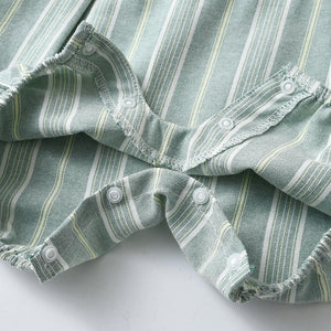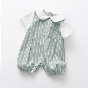 Elegante e confortevole pagliaccetto per neonato, perfetto per ogni occasione. Il design presenta un delicato motivo a righe su sfondo verde pastello, con maniche corte bianche e un raffinato colletto Peter Pan. Realizzato in tessuto morbido e traspirante, assicura il massimo comfort per il tuo bambino. La chiusura posteriore con zip e i pratici bottoncini sul cavallo facilitano il cambio. Un capo ideale per look raffinati e alla moda!