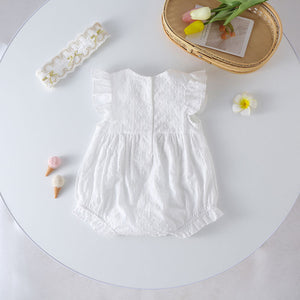 Pagliaccetto bianco per bambina dal design raffinato, arricchito da dettagli in pizzo e un elegante fiocco dorato. Le maniche a volant e le decorazioni rendono questo capo ideale per occasioni speciali, come battesimi, feste o servizi fotografici. Realizzato in tessuto leggero e traspirante, garantisce comfort per la tua piccola. Il set include una fascia coordinata con ricami dorati, per un look completo e adorabile. Chiusura a bottoni per un cambio rapido e pratico. Un capo imperdibile per il guardaroba della tua bambina!