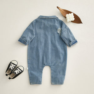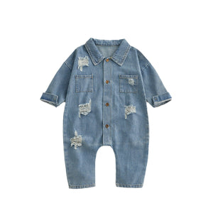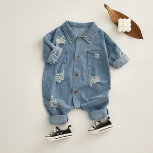 Dai un tocco di stile al look del tuo piccolo con questo pagliaccetto in jeans! Con dettagli strappati alla moda, colletto classico e chiusura con bottoni, questo capo è perfetto per un outfit casual e trendy. Realizzato in morbido denim, offre comfort e praticità per ogni occasione. Ideale per passeggiate, giochi o scatti fotografici memorabili! 👶👖✨