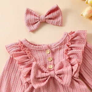 Un body adorabile e versatile, perfetto per vestire la tua bambina con stile e comfort. Realizzato in morbida maglia a costine color crema, è arricchito da eleganti volant sulle spalle e sui polsini. I bottoni in legno sul davanti e il grande fiocco coordinato aggiungono un tocco di dolcezza. Inclusa una fascia per capelli abbinata per completare il look. Ideale per giornate speciali, servizi fotografici o momenti quotidiani da ricordare.