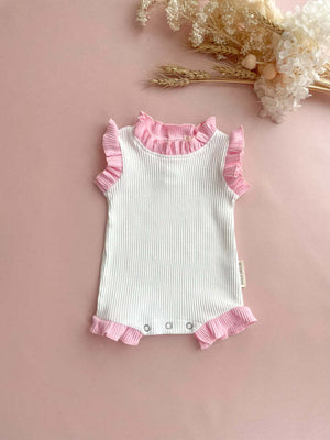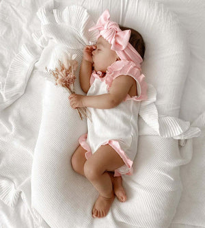Adorabile pagliaccetto per neonata in morbido tessuto a righe beige con dettagli arricciati sulle maniche e lungo l'orlo. Dotato di chiusura con bottoni a pressione per una facile vestizione. Completo di una fascia con grande fiocco coordinato per un look dolce e romantico. Perfetto per giornate speciali, servizi fotografici o semplicemente per coccolare la tua piccola con stile e comfort. Disponibile in diverse taglie. Scegli il meglio per la tua principessina!