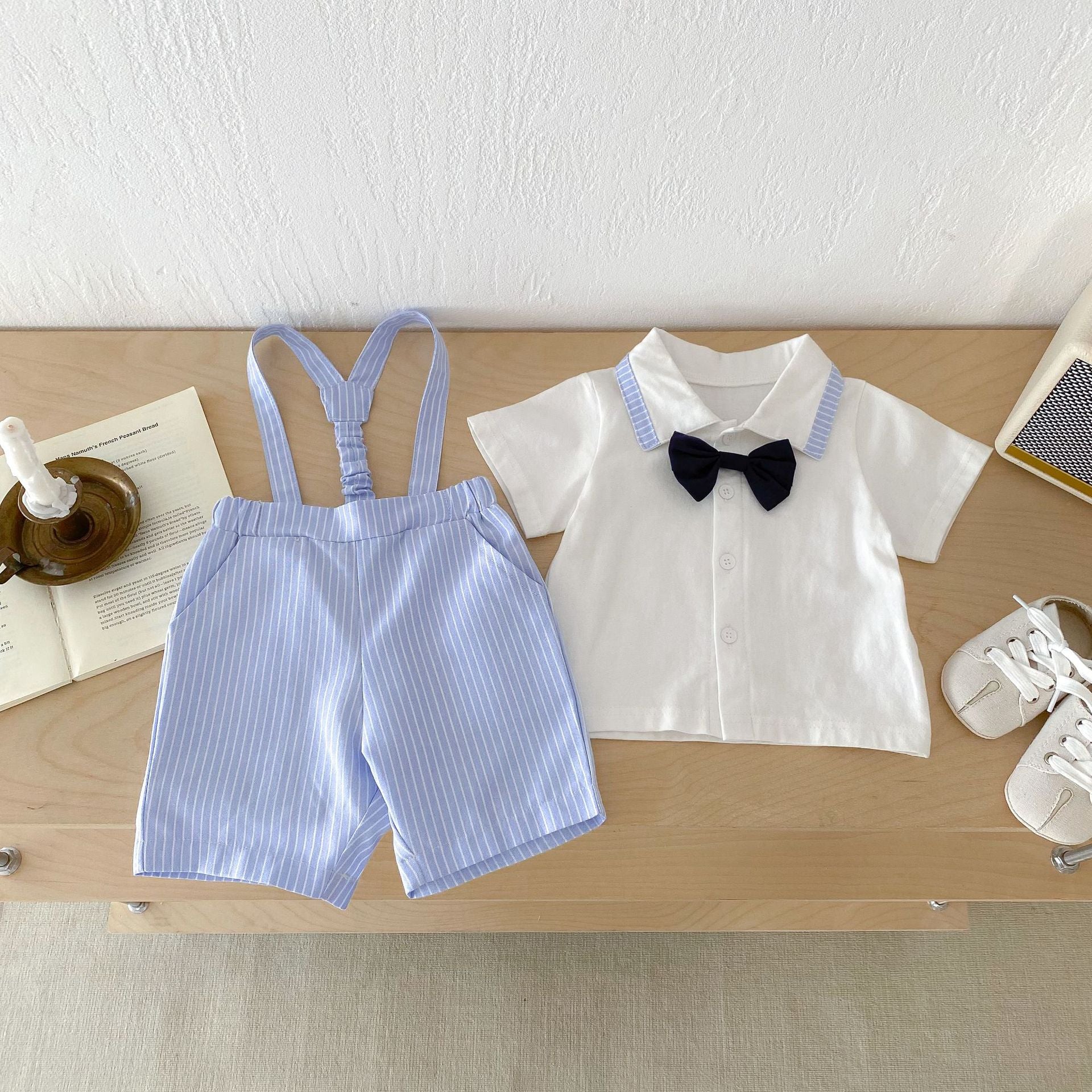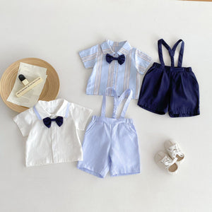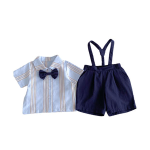 abbigliamento elegante per bambino, composto da camicia a maniche corte con papillon e pantaloncini con bretelle. Disponibile in due varianti: bianco-azzurro e azzurro-blu. Ideale per cerimonie, feste o occasioni speciali, con un design raffinato e dettagli curati. Realizzato in tessuto leggero e confortevole per garantire il massimo comfort. Perfetto per un look chic e adorabile