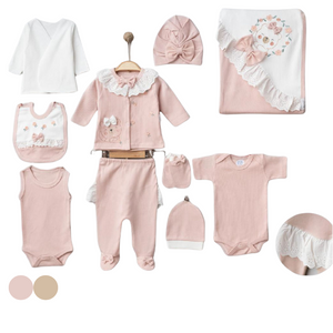 Incantevole set per neonata in morbido cotone, caratterizzato da tonalità rosa cipria e dettagli raffinati in pizzo. Il set include: una maglia bianca incrociata, una giacchina con ricami e colletto in pizzo, pantaloni con piedini, body a canotta e a maniche corte, un cappellino, una fascia per capelli con fiocco, guantini, un bavaglino decorato e una copertina abbinata con ricami floreali. Perfetto per donare comfort e stile nelle prime giornate di vita del tuo piccolo.