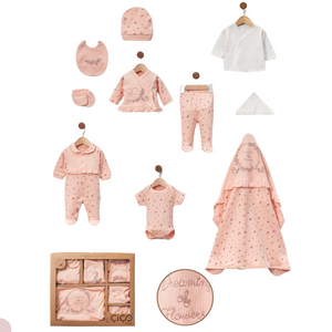Un elegante set nascita per neonata, perfetto per accogliere la tua piccola con dolcezza e comfort. Realizzato in cotone morbido e traspirante, questo set include body, tutina, maglietta incrociata, pantaloni con piedini, cappellino, bavaglino, guantini, una copertina con cappuccio ricamato e una pratica scatola regalo. Il delicato motivo floreale e il ricamo "Dreaming of Flowers" aggiungono un tocco romantico e raffinato. Ideale come regalo nascita o per comporre il primo corredino con stile e qualità.
