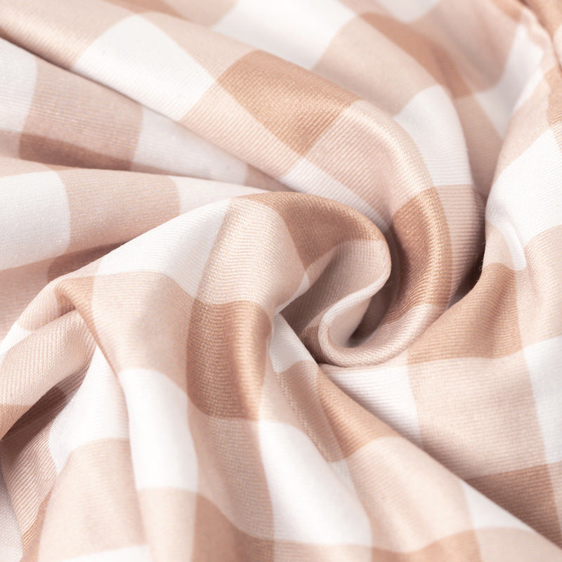 Culotte a vita alta con stampa vichy beige e balze sul retro