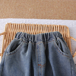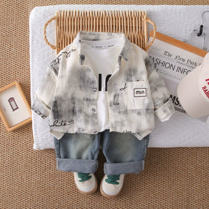 Completo casual composto da camicia leggera effetto sfumato grigio/bianco con dettagli stampati e taschino, abbinata a t-shirt bianca minimal e jeans morbidi con risvolto. Un look moderno e comodo, ideale per la stagione autunno/inverno. Perfetto per l’asilo, le uscite e il tempo libero grazie alla vestibilità confortevole e allo stile urban.