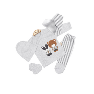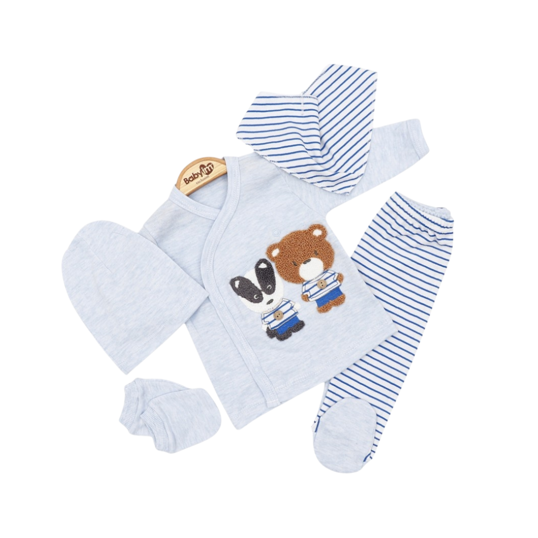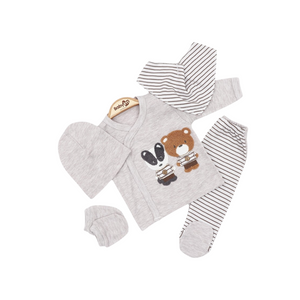 Un tenero e pratico set nascita per il tuo bebè, perfetto per i primi mesi di vita! Questo coordinato in cotone morbido è composto da una maglietta incrociata con dolce ricamo di un orsetto e un coniglietto, pantaloni con piedini a righe, cappellino e guantini per proteggere le manine delicate del neonato.