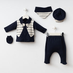 Raffinato set per neonato in morbido cotone beige, perfetto per cerimonie e occasioni speciali. Include una maglia con colletto classico, bottoni decorativi, dettagli a righe e fiocco coordinato, pantaloni abbinati con piedini, un bavaglino triangolare, un cappellino elegante e guantini. Un outfit ideale per donare stile e comfort al tuo piccolo.