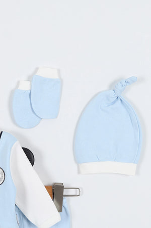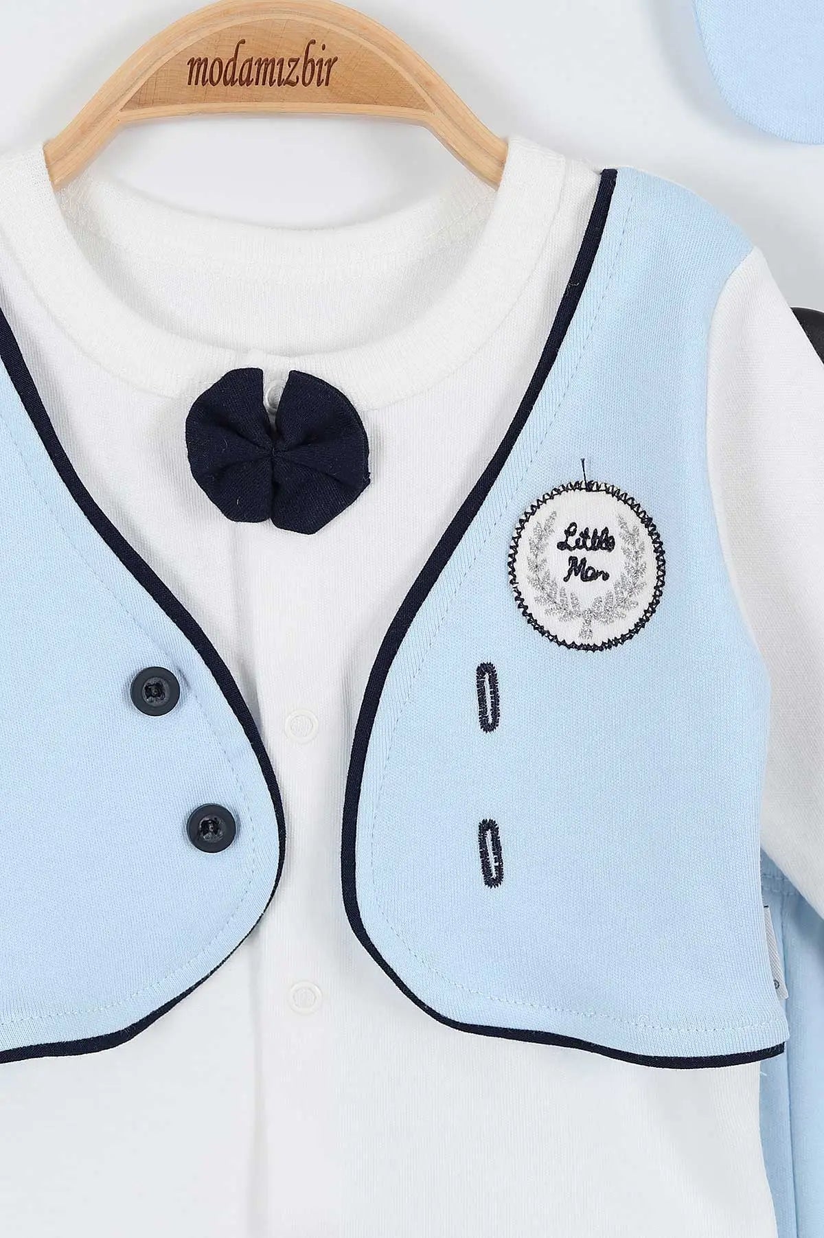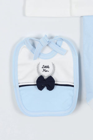 Raffinato set nascita per neonato, perfetto per le occasioni speciali e le prime foto ricordo. Il completo include una giacchina con finto gilet azzurro e dettagli da smoking, con papillon applicato e bottoncini decorativi. I pantaloni con piedini, il cappello coordinato, il bavaglino con fiocchetto ei guantini completano il look con eleganza e dolcezza. Realizzato in morbido cotone, assicura il massimo comfort per il tuo piccolo gentiluomo. Un'idea regalo perfetta per un neonato dallo stile impeccabile