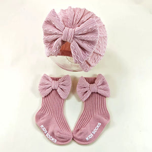 Delicato set composto da cappellino turbante con maxi fiocco e calzini coordinati, ideale per neonate da 0 a 6 mesi. Il tessuto morbido e leggermente elasticizzato garantisce comfort e una vestibilità perfetta fin dai primi giorni.