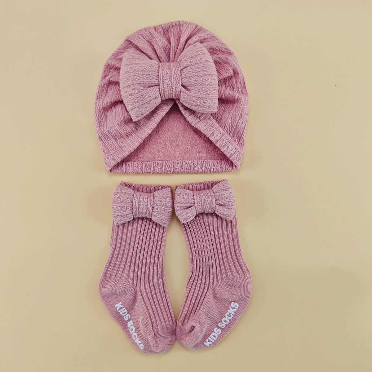Set adorabile composto da cappellino turbante con maxi fiocco e calzini coordinati, perfetto per neonate 0-6 mesi. Il tessuto morbido e leggermente elasticizzato rende il set confortevole sulla pelle dei più piccoli, ideale sia per l’uso quotidiano che per creare outfit eleganti e fotogenici.