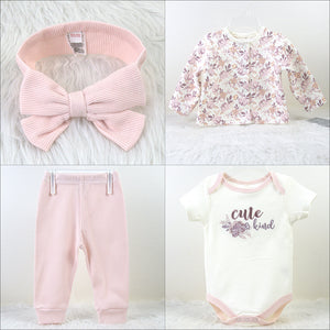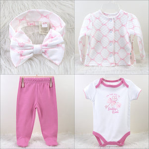 Elegante set per neonata composto da 4 pezzi coordinati: una fascia con fiocco, una giacca a maniche lunghe trapuntata con bottoni, un paio di pantaloni rosa con piedini e un body bianco con la dolce scritta "I'm the Key to Daddy's Heart". Realizzato in morbido cotone, garantisce il massimo comfort per la pelle delicata dei più piccoli. Ideale per ogni occasione, questo set unisce praticità e stile, perfetto per il guardaroba della tua bambina o come regalo speciale per i neo-genitori.