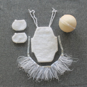 Regala al tuo piccolo un tocco di magia con questo adorabile set artigianale da fotografia, perfetto per immortalare i primi momenti della tua vita. Realizzato a mano con cura, il set include un morbido body in maglia bianca, due delicati coprispalla, una fascia con perline per la testa e un grazioso tutù in tulle e piume. Ideale per servizi fotografici neonati, battesimi o eventi speciali, questo outfit unisce eleganza e dolcezza per scatti indimenticabili.