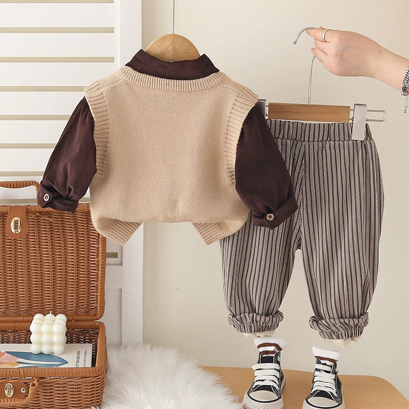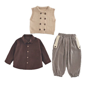 Completo raffinato perfetto per l’autunno e l’inverno, composto da camicia morbida, gilet lavorato a maglia con bottoni a doppio petto e pantaloni a righe con tasche a contrasto. Un outfit caldo, confortevole e dallo stile classico–moderno, ideale per occasioni speciali e look quotidiani ricercati. Disponibile nelle due varianti beige e marrone.