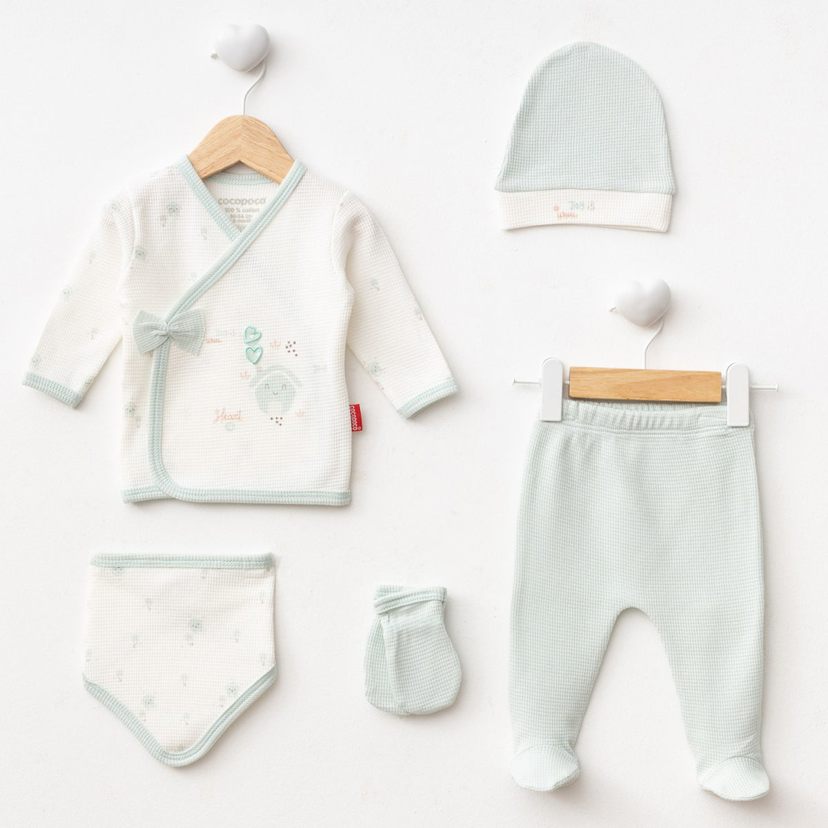 Questo meraviglioso set nascita per neonato è pensato per offrire morbidezza e protezione sin dai primi giorni di vita. Realizzato in cotone biologico ultra delicato sulla pelle, garantisce il massimo comfort e traspirabilità. Il set include: