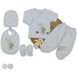 Un tenero completo per neonato, perfetto per i primi giorni di vita. Il set include una maglia a maniche lunghe con apertura incrociata, decorata con una dolce stampa di coniglietto e orsetto, pantaloni con piedini integrati, un cappellino coordinato, un bavaglino con chiusura regolabile e guantini antigraffio. Realizzato in morbido cotone traspirante, assicura il massimo comfort e protezione per la pelle delicata del neonato. Il design delicato in azzurro e beige lo rende ideale per il corredino nascita o come dolce regalo per una nuova vita.