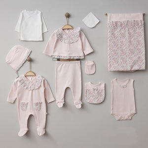 Un raffinato set nascita da 10 pezzi per neonata, realizzato in morbido cotone rosa con incantevoli dettagli a fantasia floreale lilla, rosa e verde. Il kit comprende: